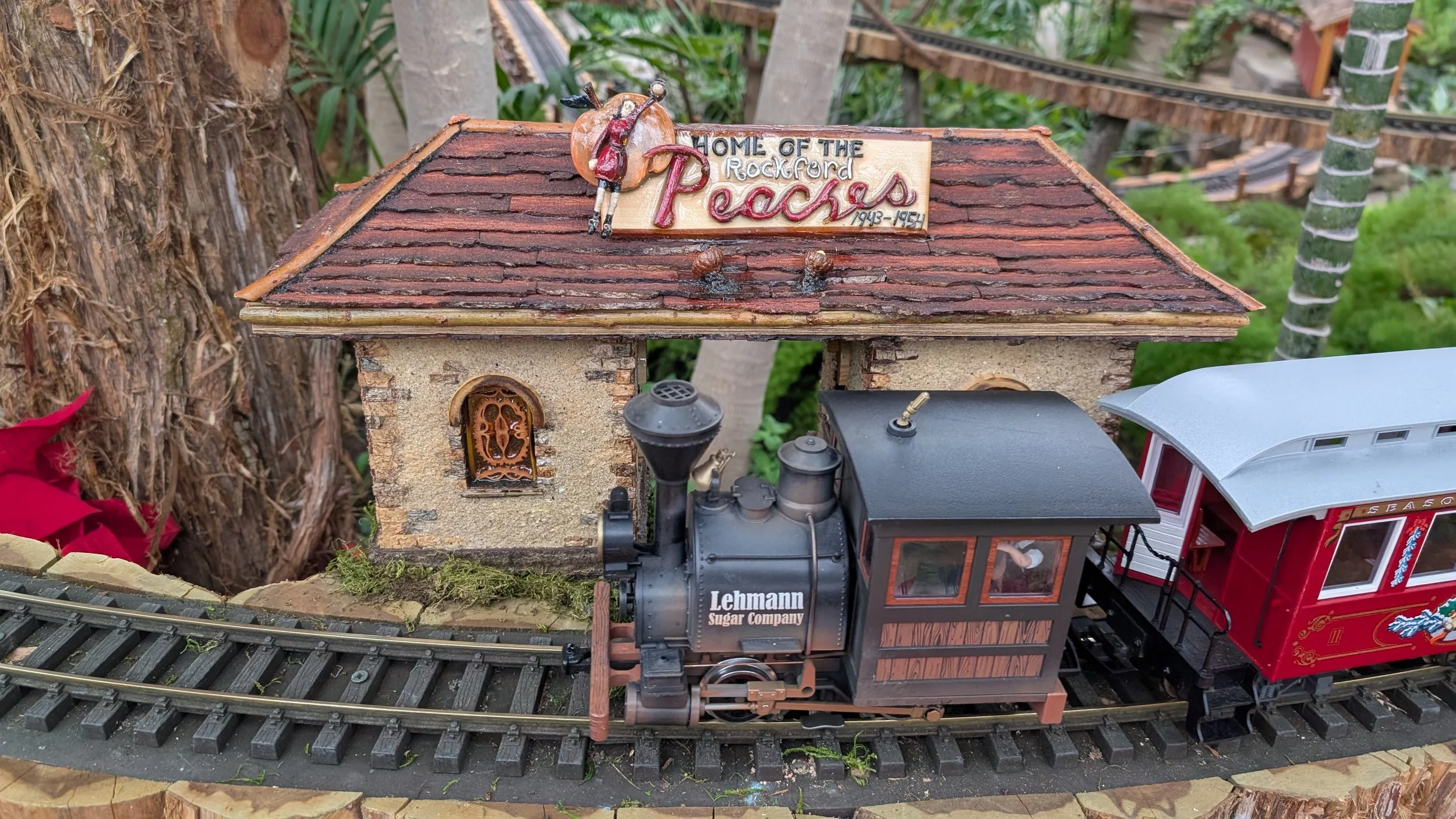 Miniature Rockford landmarks and willow trestle bridges add to the enchanting ambiance.